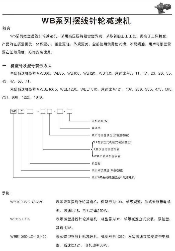 WB系列微型擺線針輪減速機描述機型號和規(guī)格表示法